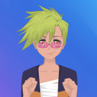 A pet groomer with spiky green hair and cat ears smiles while holding a dark cat. The background features colorful decor, suggesting a playful or animated setting. For International Pet Groomer Aporeciation Day 2025.