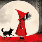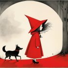 A girl in a red hooded cloak stands in a forest, accompanied by a black dog. They face a large moon, with the landscape featuring dark trees and striking red hues. A sense of mystery pervades the scene.