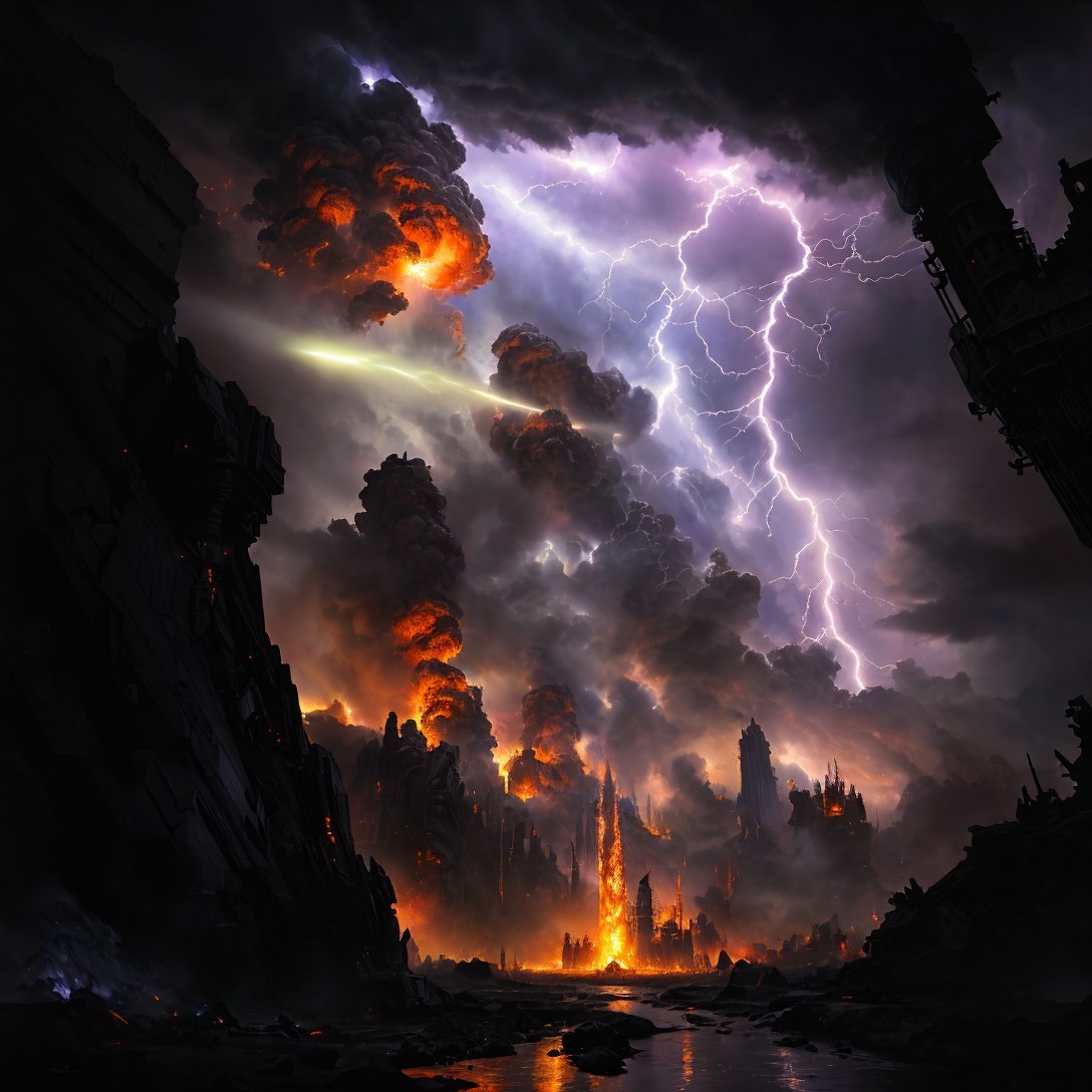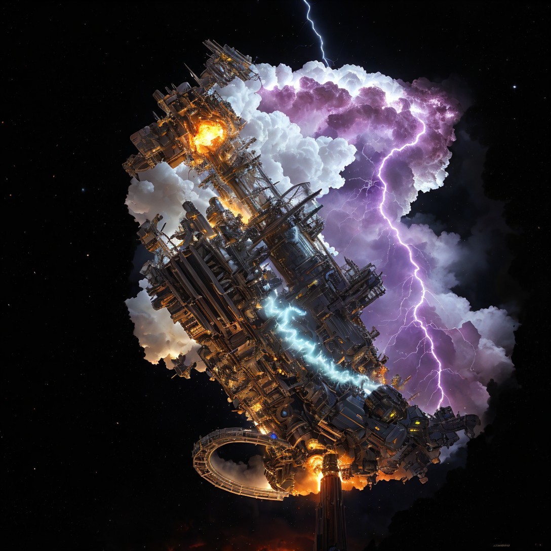 Dystopian cityscape at night with towering spires and dramatic lightning.