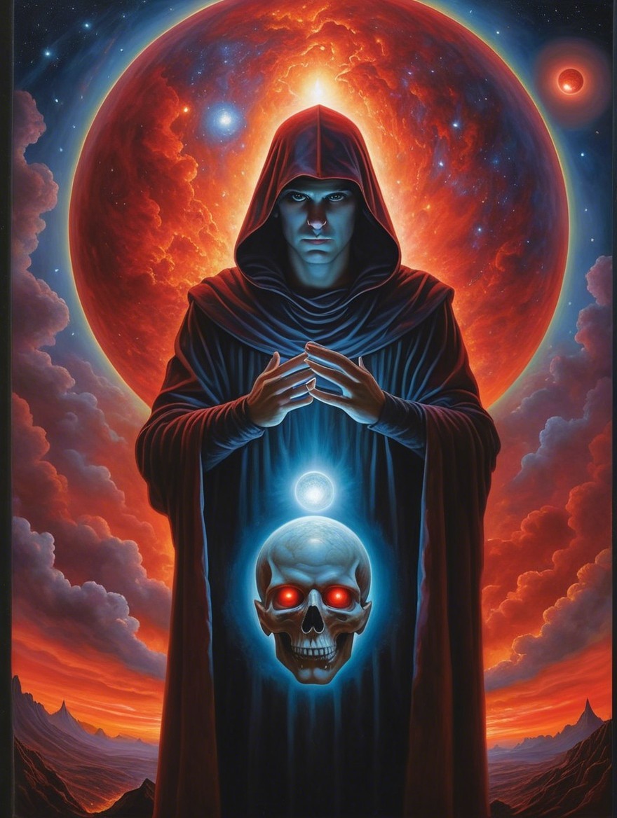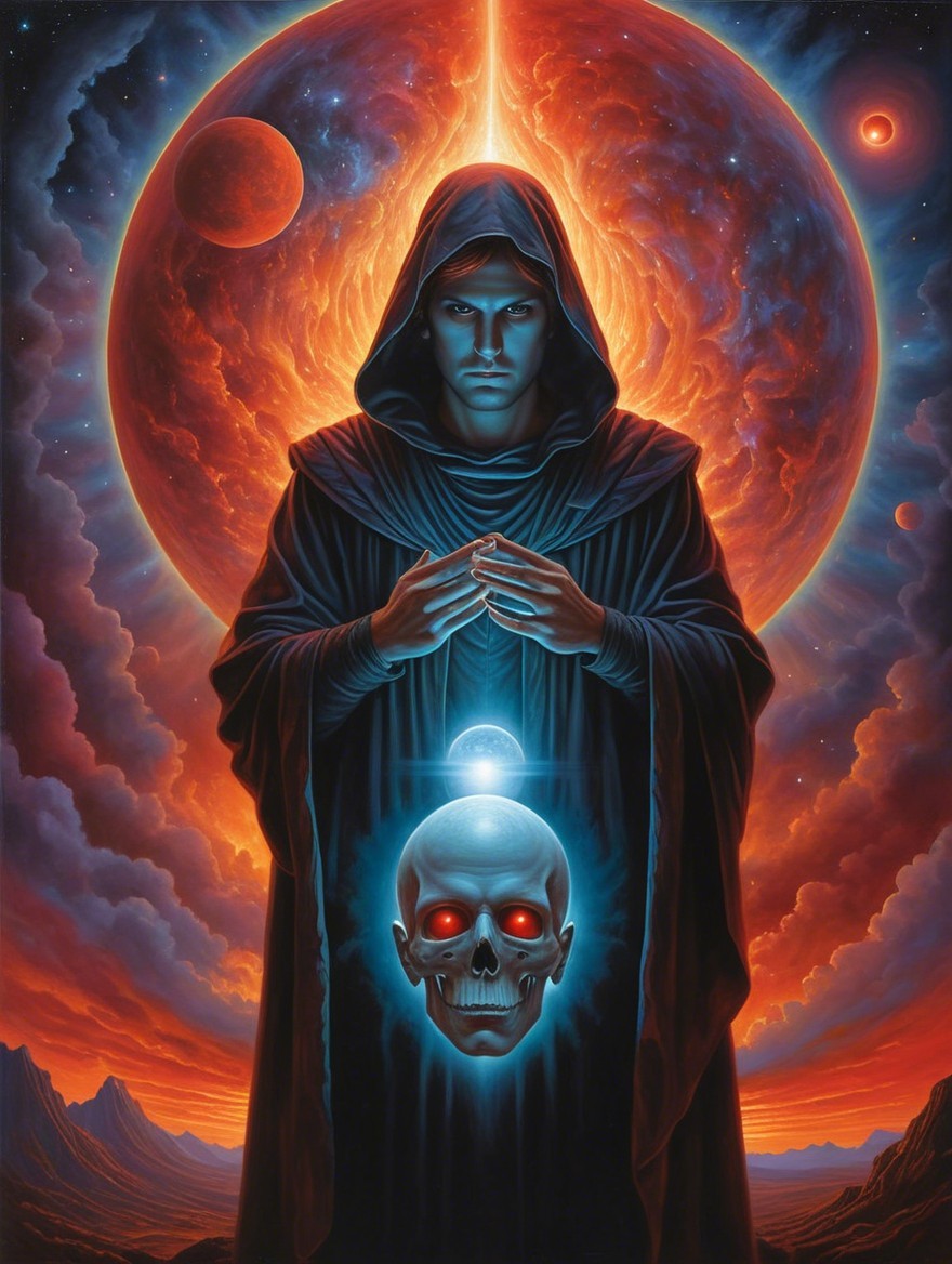 Cloaked Figure with Glowing Orb in Cosmic Setting