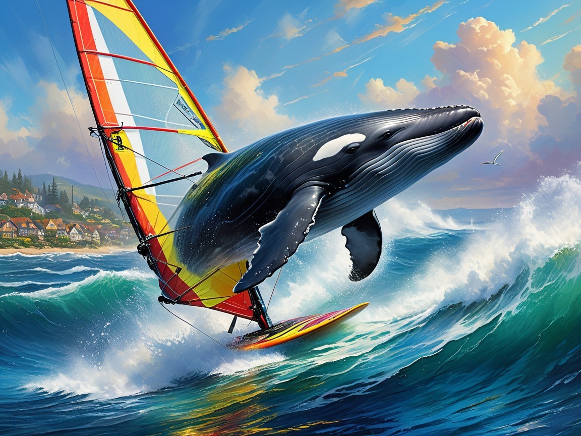 A giant whale breaches the ocean's surface near a colorful windsurfer, creating a dynamic scene with vibrant waves and a scenic backdrop of hills and homes under a bright sky.