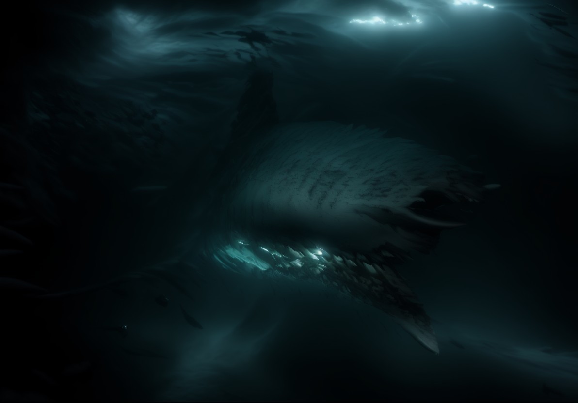 Prompt: Create an image of an underwater scene with a colossal, enigmatic Otodus Megalodon creature lurking in the depths of the ocean. The focal point is the massive, shadowy silhouette of the creature, its body barely visible amidst the dark, murky waters. The creature's distinct features include a series of glowing bioluminescent spots along its underbelly, providing a subtle, mysterious illumination. Its skin appears to have a rough texture, with subtle gradients of dark blues and blacks, and scattered with faint, lighter scratch-like markings or barnacles, giving an impression of aged, weathered hide. It is viewed from a side angle with its head slightly bowed, facing towards the left of the composition.