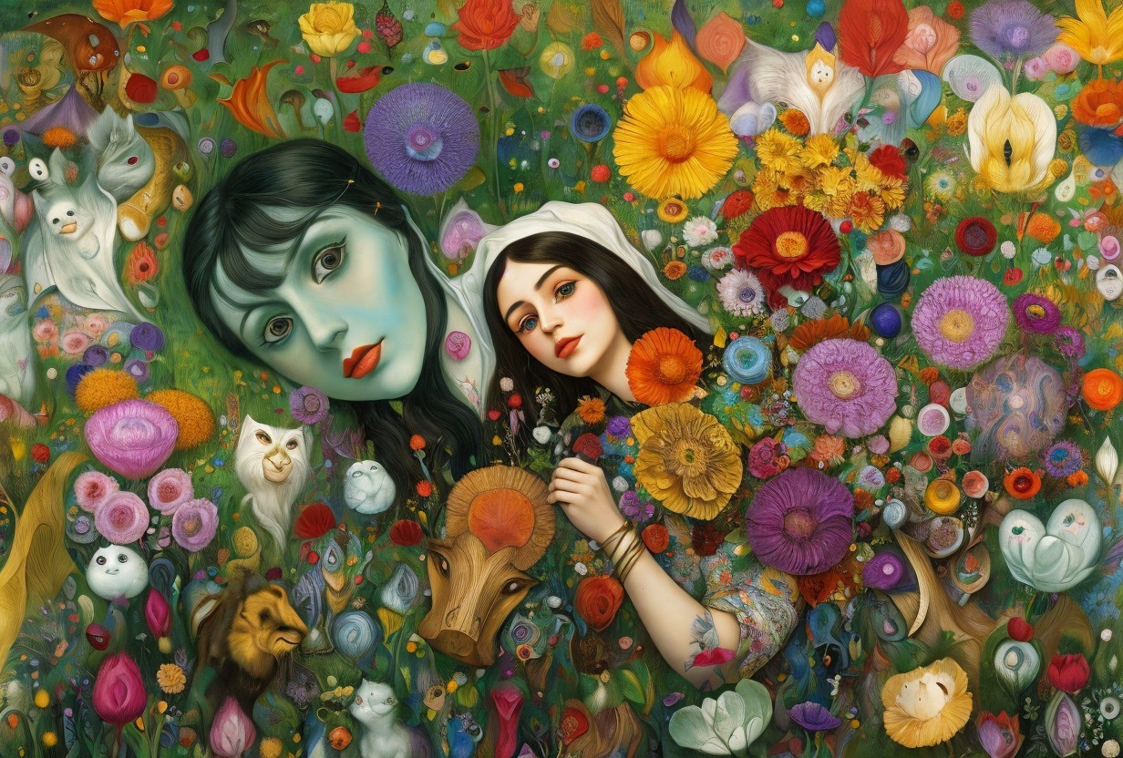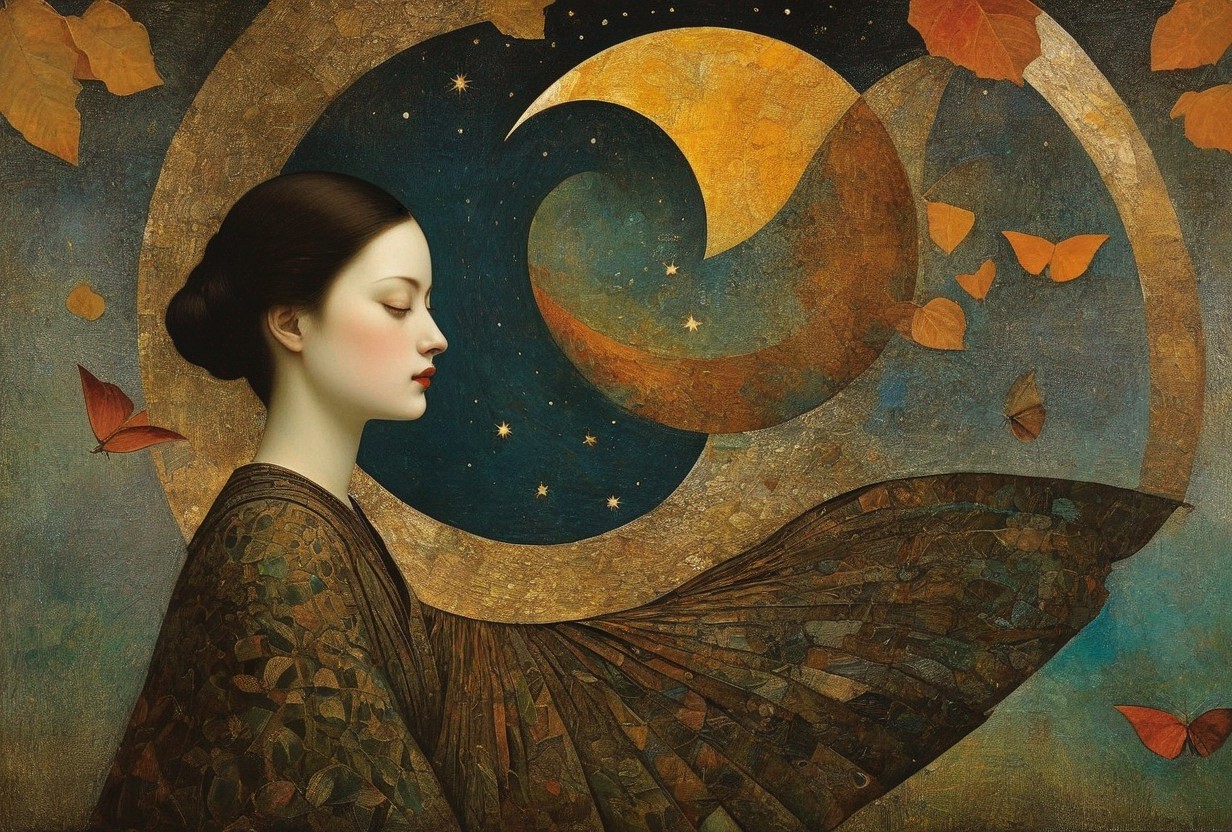 A serene woman with an elegant bun gazes downward against a background of geometric shapes and warm tones, evoking a serene, contemplative mood.