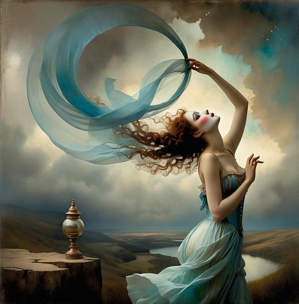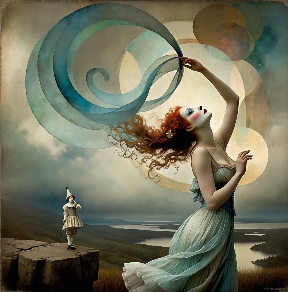 A whimsical clown with vibrant red curls poses gracefully, holding colorful balloons against a dreamy landscape with a serene moon, quaint houses, and rolling hills in the background.