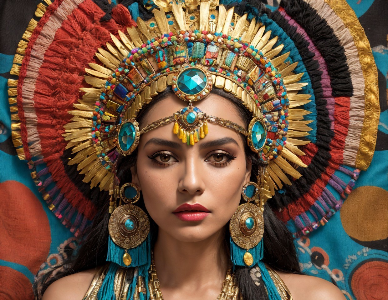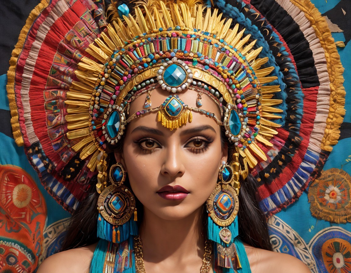 Ancient princess, pre-Hispanic-futuristic twist, Mexican textile patchwork, post-punk Vogue, Versace glamour, Gothic, New Age, Enki Bilal, Paul Klee, Jennifer Lommers, Hans Hartung, Alfaro Siqueiros, Mark Rothko, Jesus Clemente Orozco, Diego Rivera, Remedios Varo, Sebastián, 8K hyper-realistic photography, golden ratio composition, unsettling ambiance, Guillermo del Toro film, Aztec motifs, biblical motifs, geometric patterns, analog photography, oil painting finish, H.R. Giger maximalism, novelty architecture, pastel shades, crepuscular luminosity, hyper-structured minimalism, emotional reactions, anatomical proportions, radiant skin tones, volumetric lighting, dark age aesthetic.