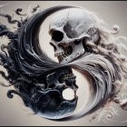 The image features two intricately designed skulls facing each other, one in white with flowing light-colored hair and the other in black with dark hair, set against a surreal, rocky backdrop.