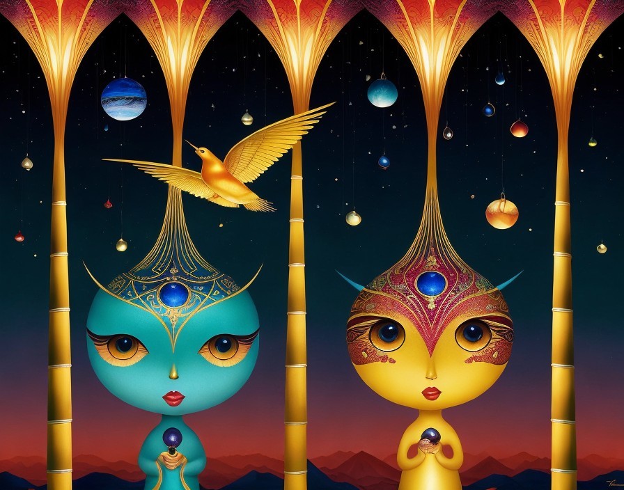 golden bamboo leaves, blue birds, galactic attractive human-like alien spirits, by Megan Duncanson, By Enki Bilal, By Joan Miro, By Nicoletta Ceccoli, By Jasmine Becket Griffith, By Tim Burton, Egyptian Nouveau Art, Whimsical Pop Surrealism Art, Neo-Fauvism Art, Kitsch Art Movement Style, Whimsical Escapism Art, royal colors burgundy royal blue emerald