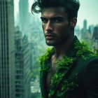 A man stands amidst a city skyline, wearing a suit adorned with vibrant green moss. His intense gaze and tousled hair create a striking contrast against the urban backdrop.
