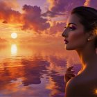 A serene profile of a woman adorned with floral accessories and elegant earrings, set against a vibrant sunset reflecting on a calm lake, surrounded by soft, glowing sparkles.
