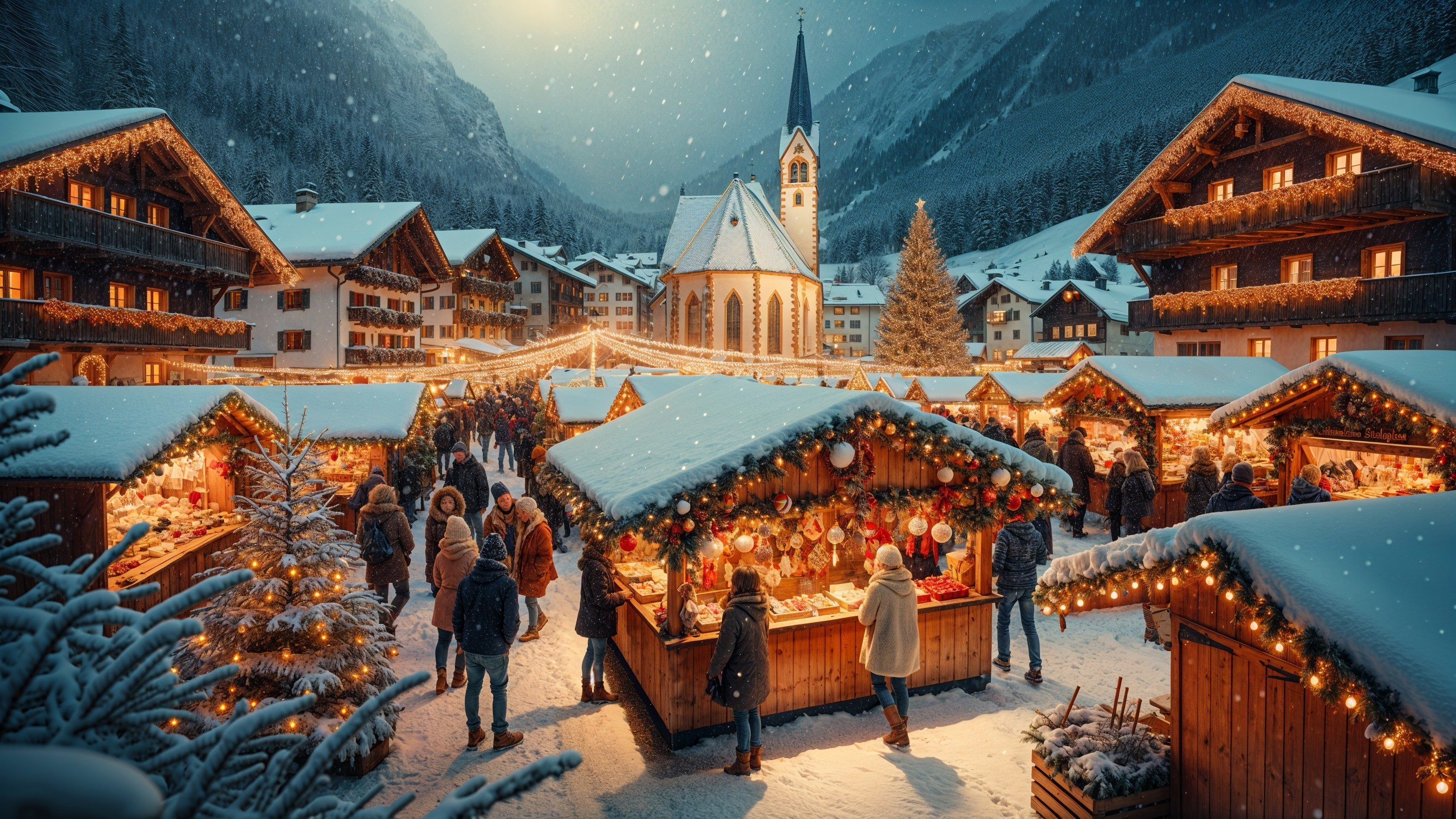 A charming winter market adorned with festive lights and decorations, nestled among snow-covered buildings. People browse stalls filled with handmade gifts, creating a cozy, cheerful atmosphere.
