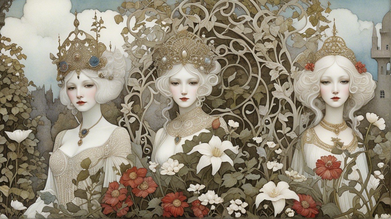 Three elegantly dressed women stand amidst intricate swirling patterns and nature. Each adorned with ornate accessories, they exude a regal charm, embodying beauty and mystique in a serene setting.