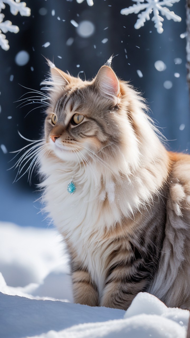 A fluffy tabby cat sits gracefully in the snow, with delicate snowflakes gently falling around it. Its striking green eyes and luscious fur create a beautiful winter scene.