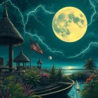 Dramatic Night Scene with Full Moon and Ocean Waves