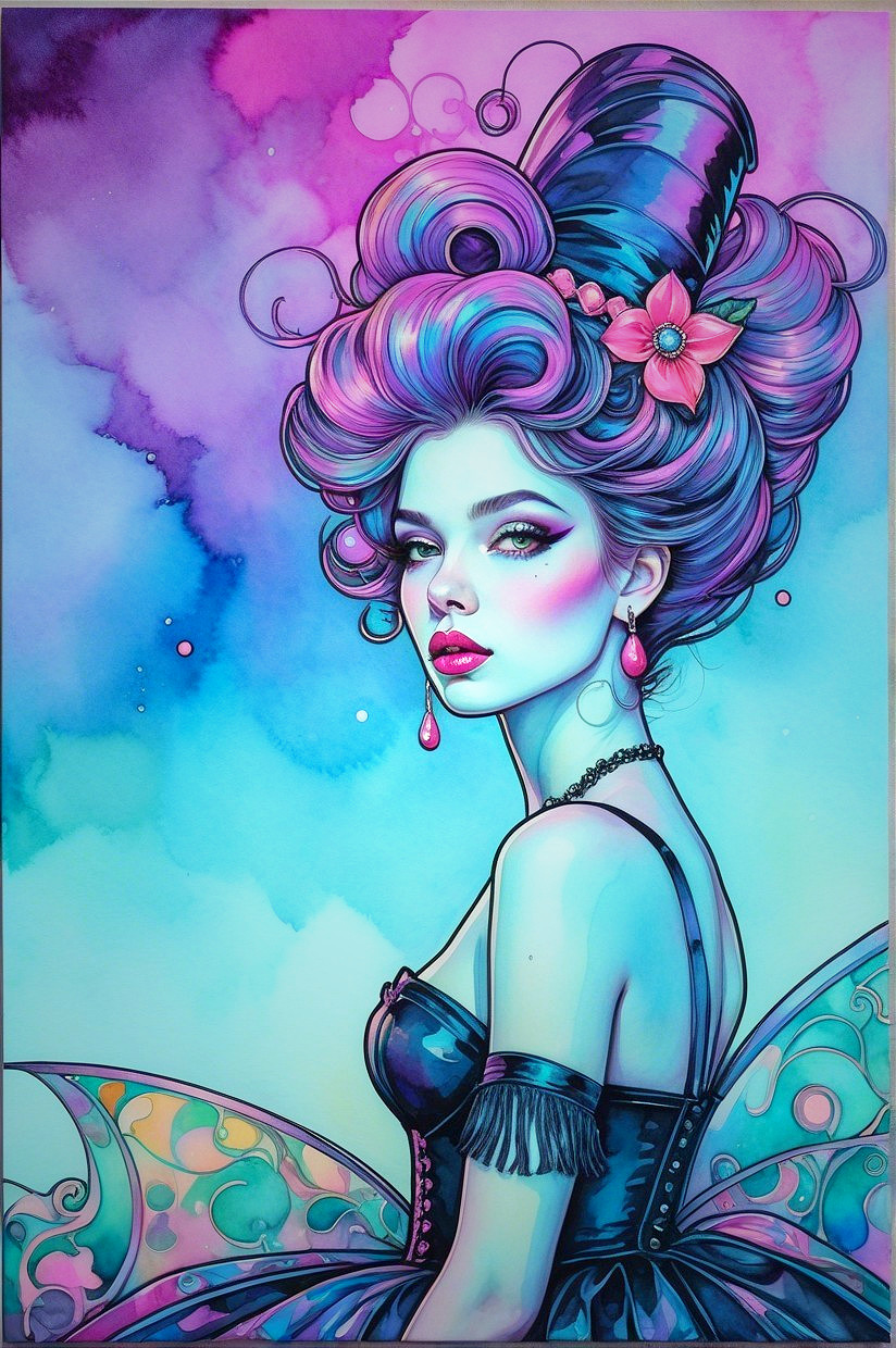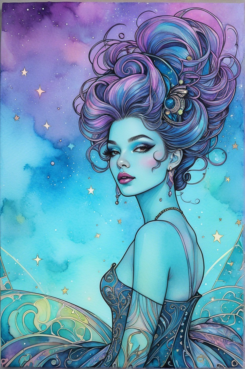 Prompt: "Vibrant watercolor portrait of a female diva in a Bubblegum Witch style, featuring fine lines and artistic embellishments. Retro psychedelic style. The artwork, reminiscent of Art Nouveau, showcases hyperfeminine Witchcore elements with a dark gothical fantasy twist, upper body portrait, side view, highlighting the diva's pale skin, gradient inking colors in vibrant starfleet-blue and light-blue hues, warm blend of pastel tones, dynamic lighting is soft and diffused, enhancing the Bubblegum witch style, intricate line-art showcasing futuristic elements blending Cyberpunk and foampunk aesthetics, set in a 1970s Retrofuturistic Psychedelic Style inspired by Nam Yune Paik and Marcel Duchamp, contouring outlines and line-art details, watercolor and ink style inspired by Stan Lee, visble watery textures, light particles adding to the mystic atmosphere, reflective mapping, swirling patterns of light and vivid colors, emphasizing the fusion of Georgia O'Keeffe's artistic flair and John Buscema's stylization, colored inked and wavery gouache. Ink splashes and textured layers heighten the surreal mood, blending vivid hues of traumacore style. Byzantine face type. 128k, UHD, HDR, balanced coloring. Mip-mapping 1.3, displacement mapping, reflective mapping. Envision a play of light and shadows, with pastel hues and urban tones, creating a soft, diffused ambiance. Emphasize translucent layering and intricate details, evoking a sense of dreamlike intimacy."