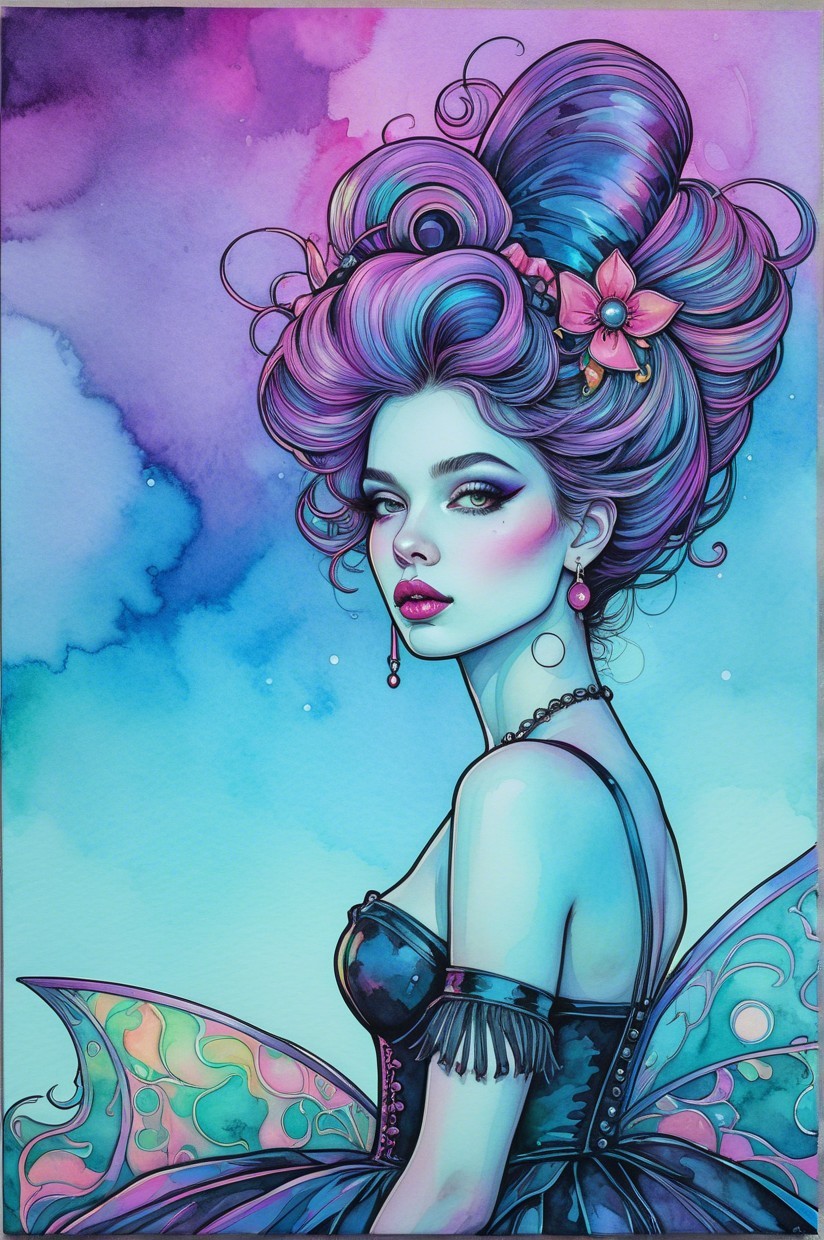 Vibrant watercolor portrait of a female diva in a Bubblegum Witch style, featuring fine lines and artistic embellishments. Retro psychedelic style. The artwork, reminiscent of Art Nouveau, showcases hyperfeminine Witchcore elements with a dark gothical fantasy twist, cs-cr1stal-v2, UHD, HDR, 128k, 3d effects, dynamic lighting from top to bottom, upper body portrait, side view, highlighting the diva's pale skin, gradient inking colors in vibrant starfleet-blue and light-blue hues, warm pinkish blend of pastel tones, dynamic lighting is soft and diffused, enhancing the Bubblegum witch style, intricate line-art showcasing futuristic elements blending Cyberpunk and foampunk aesthetics, set in a 1970s Retrofuturistic Psychedelic Style inspired by Nam Yune Paik and Marcel Duchamp, contouring outlines and line-art details, watercolor and ink style inspired by Stan Lee, visible watery textures, light particles adding to the mystic atmosphere, reflective mapping, swirling patterns of light and vivid colors, emphasizing the fusion of Georgia O'Keeffe's artistic flair and John Buscema's stylization, colored inked and wavery gouache. Ink splashes and textured layers heighten the surreal mood, blending vivid hues of traumacore style. Byzantine face type. 128k, UHD, HDR, balanced coloring. Mip-mapping 1.3, displacement mapping, reflective mapping. Envision a play of light and shadows, with pastel hues and urban tones, creating a soft, diffused ambiance. Emphasize translucent layering and intricate details, evoking a sense of dreamlike intimacy.