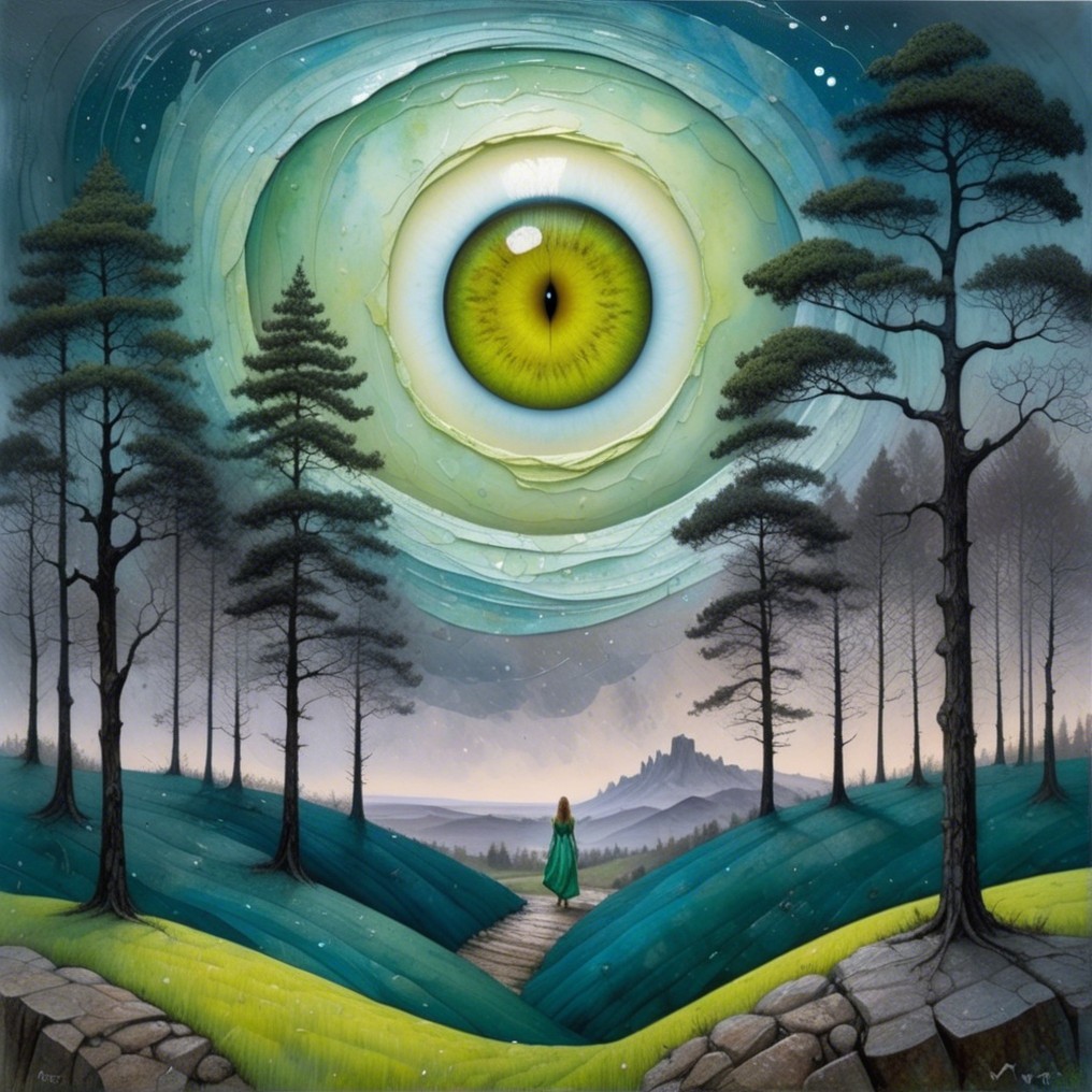 A surreal landscape features a giant, watchful eye above a tranquil scene. A figure in a flowing green dress walks along a winding path, flanked by towering trees and distant mountains.