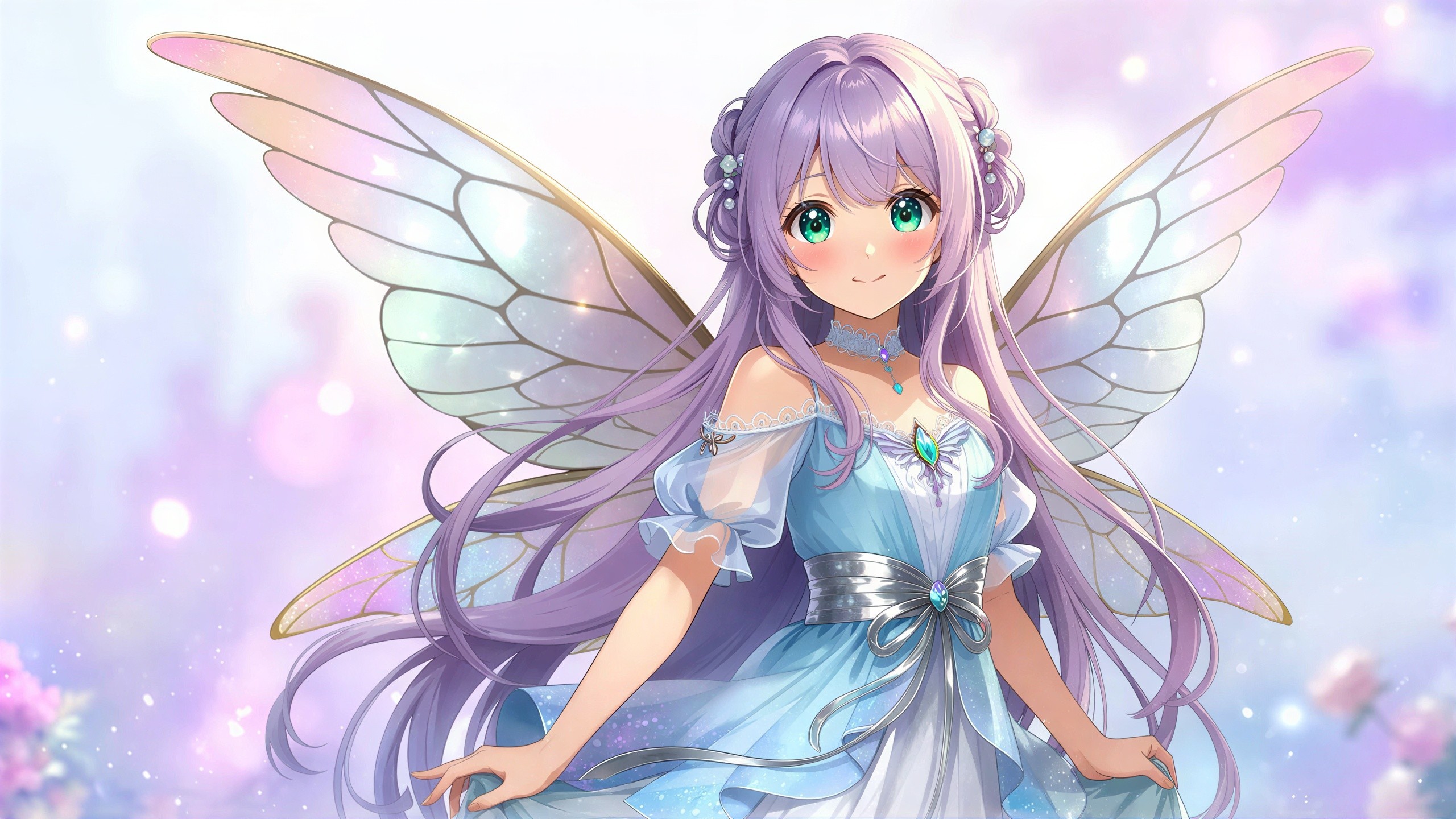 A charming anime girl with delicate, feathered wings embodies a whimsical spirit. Her bright eyes sparkle with curiosity, and her playful demeanor invites adventure in a vibrant, fantastical world.