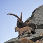 "A majestic Alpine Ibex stands proudly atop a rugged, rocky outcrop, accompanied by a smaller, younger ibex kid. The adult ibex, dark brown in color, possesses impressively long, curved horns that reach high above its head, signifying its maturity and dominance. Its gaze is fixed and alert, scanning the horizon. The kid, a lighter brown hue, stands slightly in front of its parent, mirroring its posture but with an air of youthful curiosity.