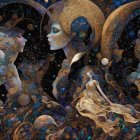 A regal woman with flowing dark hair adorned with flowers gazes confidently. She wears a flowing white dress, gold jewelry, and stands against a backdrop of swirling clouds and soft light.