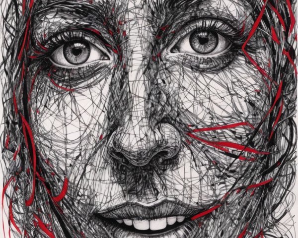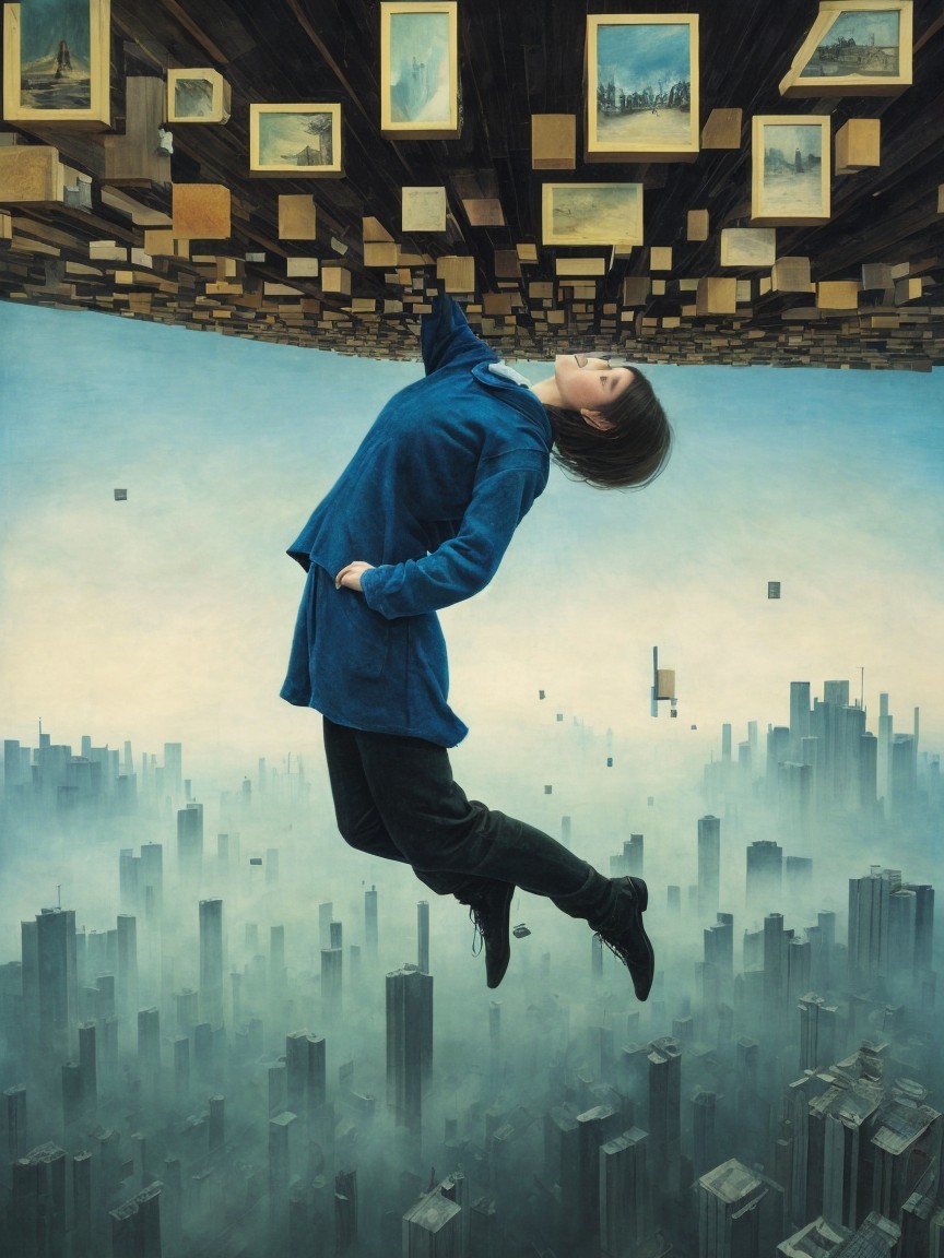 Prompt: Tool music video playing at midnight, Cinta Vidal defies gravity and architectural conventions to create encapsulated scenes of intersecting perspectives. Painted with acrylic on wood panel, Vidal refers to the paintings as "un-gravity constructions" and says that each piece examines how a person's internal perspective of life may not match up with the reality around them. A refined art, art brut, a decadence deck art, clad in a flowing, Art Deco-inspired gown, with a long, curved cigarette holder and a wide, floppy brim hat, stands poised amidst a dreamlike atmosphere, as if lost in thought. Her sleek, geometric form dissolves into bold, expressive brushstrokes, reminiscent of Franz Kline's abstract expressionism and Salvador Dali's surrealist tendencies.