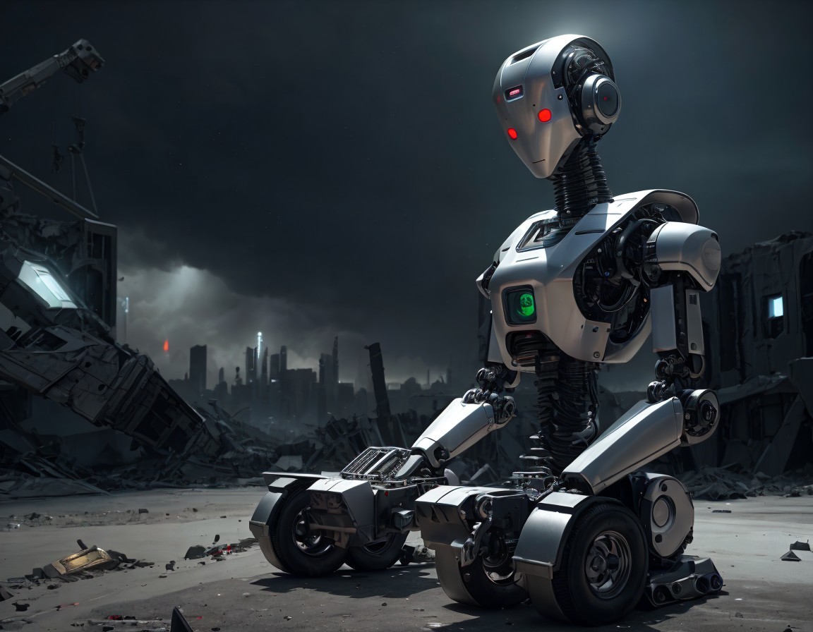 A humanoid robot sits on a wooden floor with dim lighting, surrounded by plants, exuding a contemplative aura.