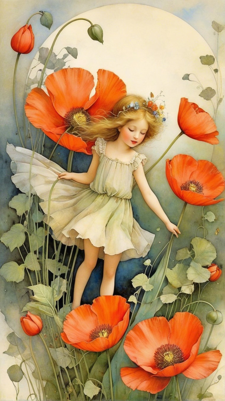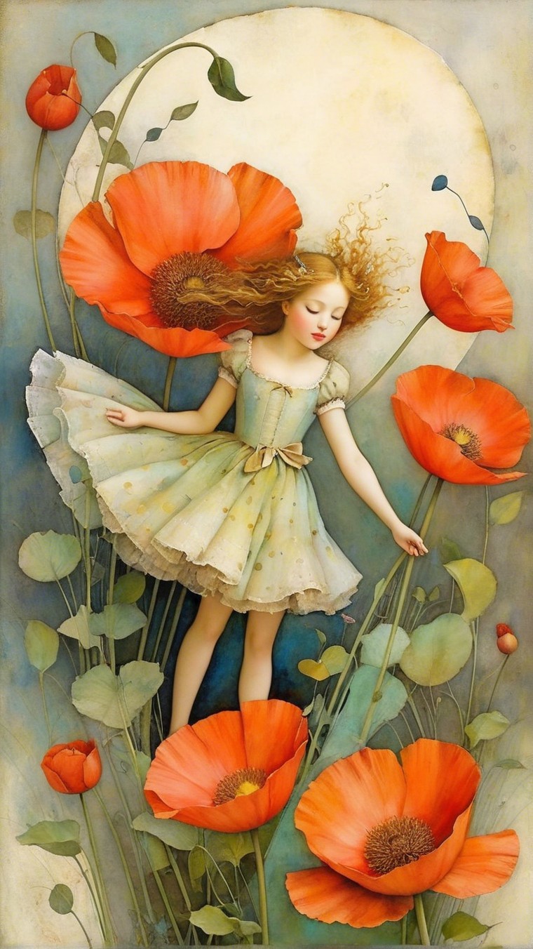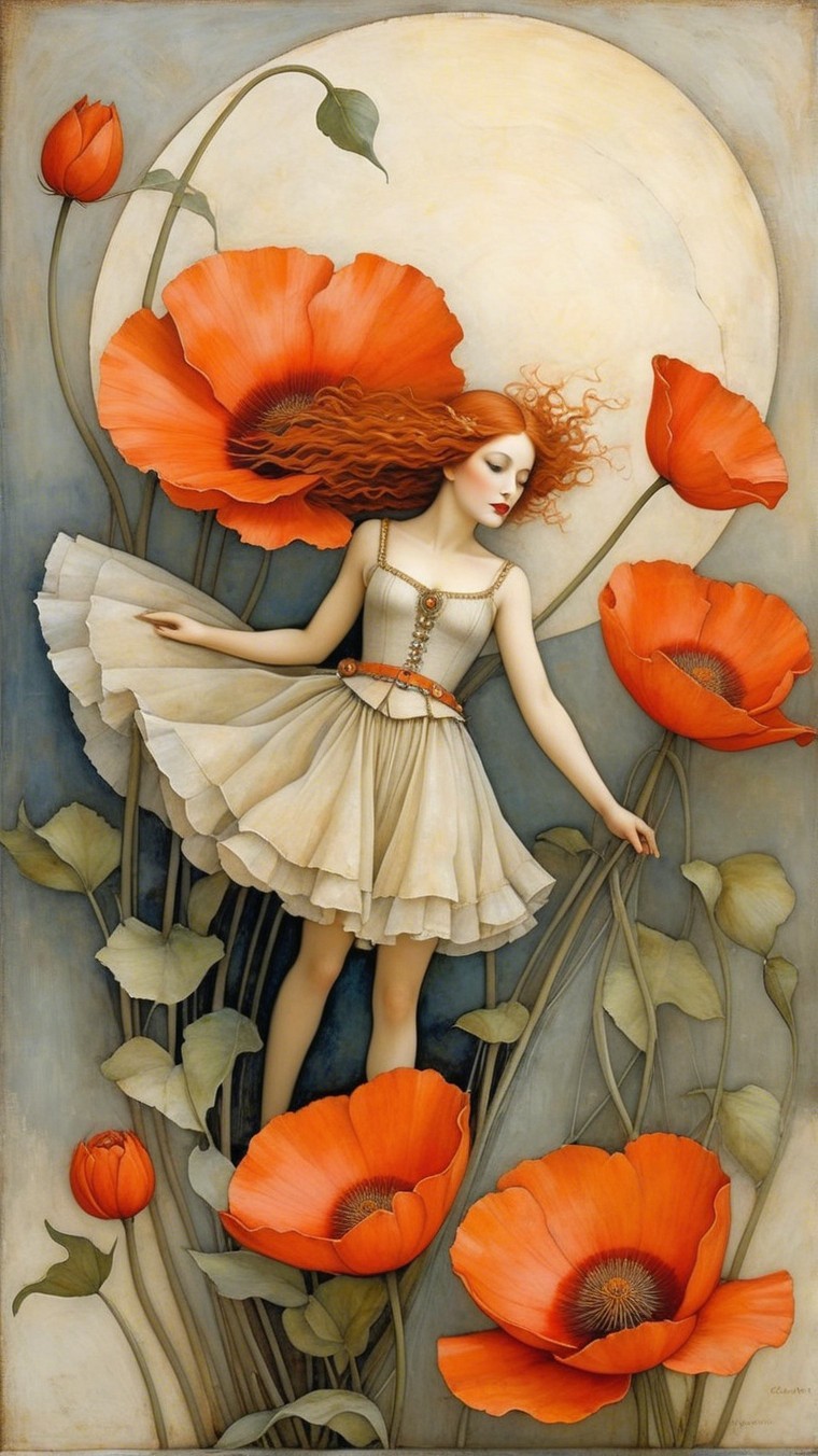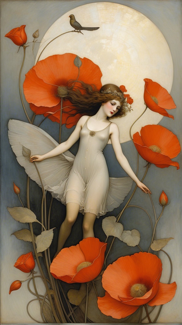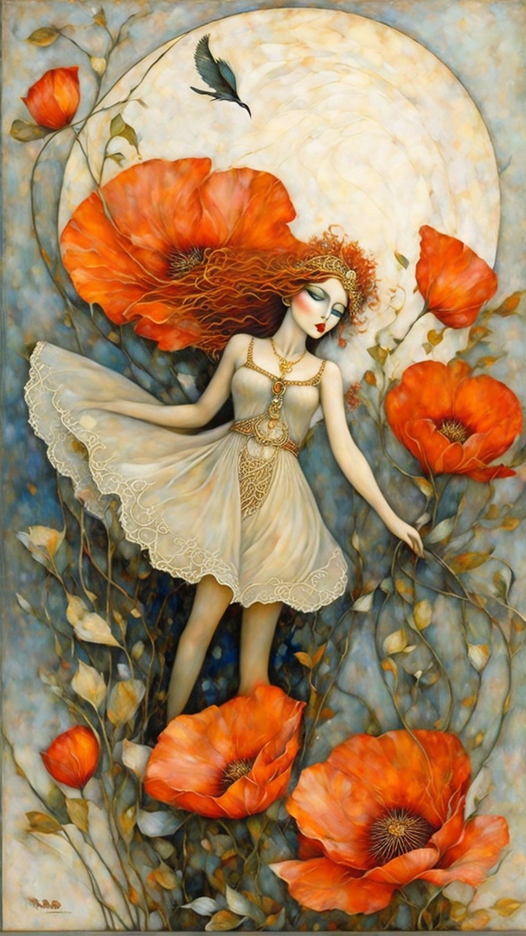 A stylized portrait of a woman with dark hair and elegant attire, adorned with vibrant red poppies. She wears a dramatic red headscarf, set against a luminous moonlit background.