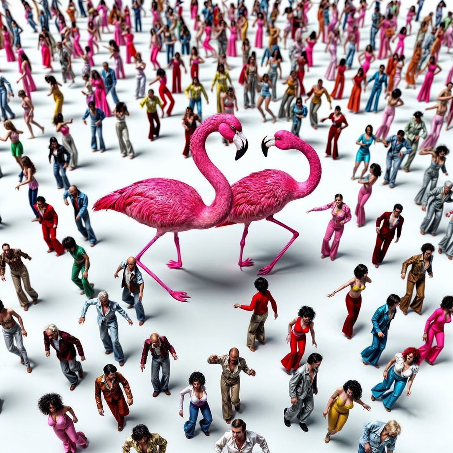 A serene scene features vibrant pink flamingos standing gracefully in a tranquil lagoon, surrounded by blooming lotus flowers, under a glowing full moon with twinkling stars.