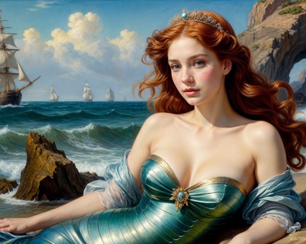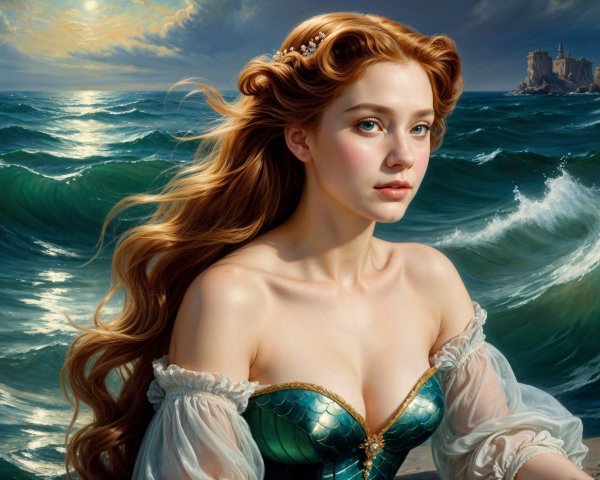 A young woman gazes thoughtfully from a balcony, her flowing hair elegantly styled. Behind her, a serene river cityscape unfolds, blending historical architecture with natural beauty.