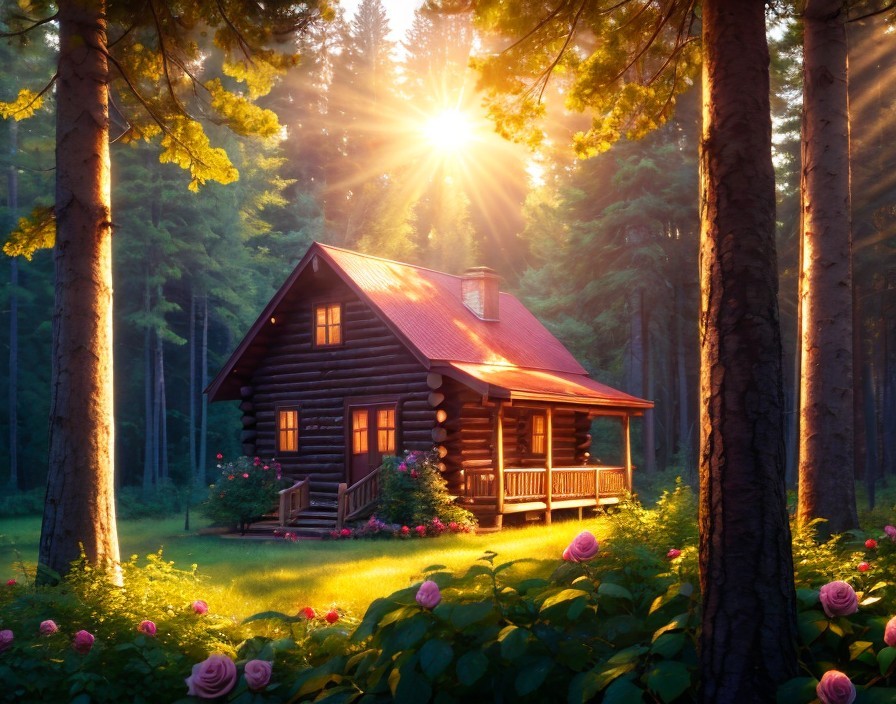 Prompt: log cabin surrounded by berry bushes, hidden in summer forest, rays of morning sun shining through dense trees, tabby cat sleeping in sunshine on cabin's porch