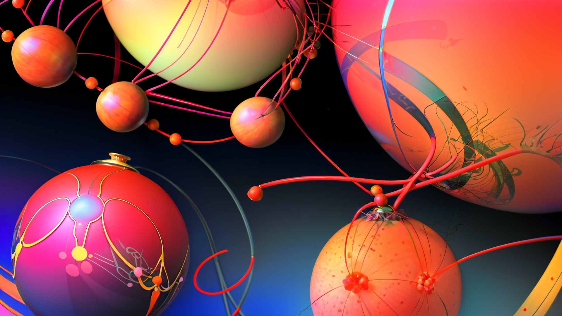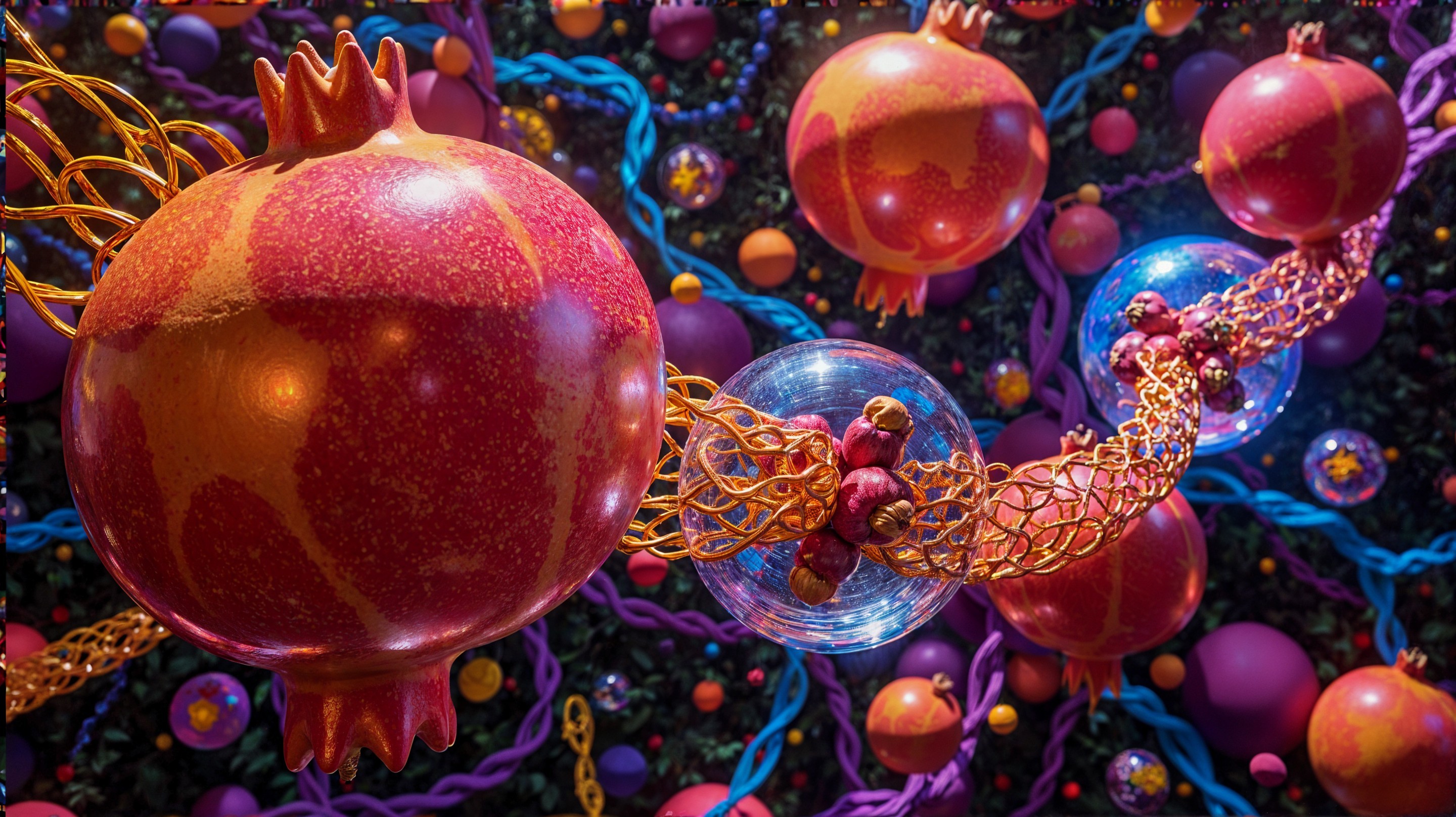 A vibrant scene featuring glossy pomegranates surrounded by colorful, iridescent bubbles. The background is a web of intertwined, bright lines, creating a dynamic and whimsical atmosphere.