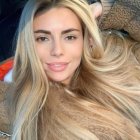 A close-up portrait of a woman with long, flowing blonde hair, flawless skin, and striking makeup. She wears delicate earrings and poses softly against a blurred background.