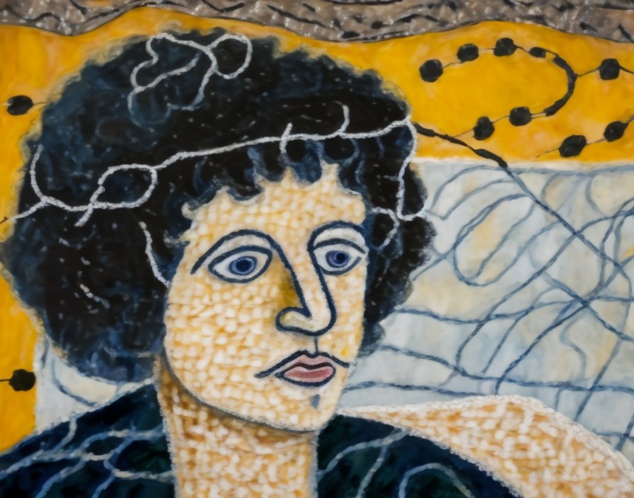 A close-up of a mosaic shows a stylized face with blue eyes, surrounded by colorful, intricate patterns.