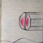 The image features a stylized, angular object resembling a futuristic spacecraft, hovering above a barren landscape. It emits a glowing red light from its underside, contrasted against a muted background.