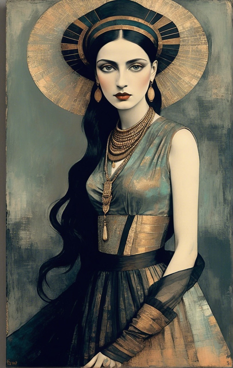 Queen of the Nile. foggy nostalgia, portrait in Burnt umber and soft teal, salmon gold, smoke and mirrors, patina of, battery acid, art brut, moody, somber, desaturated colors, in the style of Paul Klee, Arthur Rackham Dark and moody oil painting of a woman with piercing black eyes, inspired by the works of John Singer Sargent and Edgar Degas, long shot, realistic texture, dramatic lighting, intricate details on clothing and Magical woman fading tones of melancholy and summer nostalgia, soulful portrait, in burnt umber, plutonium, patina of mercury glass, tea stains, art brut, moody, somber, desaturated colors, in the style of Paul Klee, Banksy, Arthur Rackham, based on Prompt by KRW