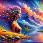 A vibrant landscape features a majestic woman with flowing, colorful hair merging with a serene lake. Two figures walk along a path, surrounded by lush trees and dramatic mountains at sunset.