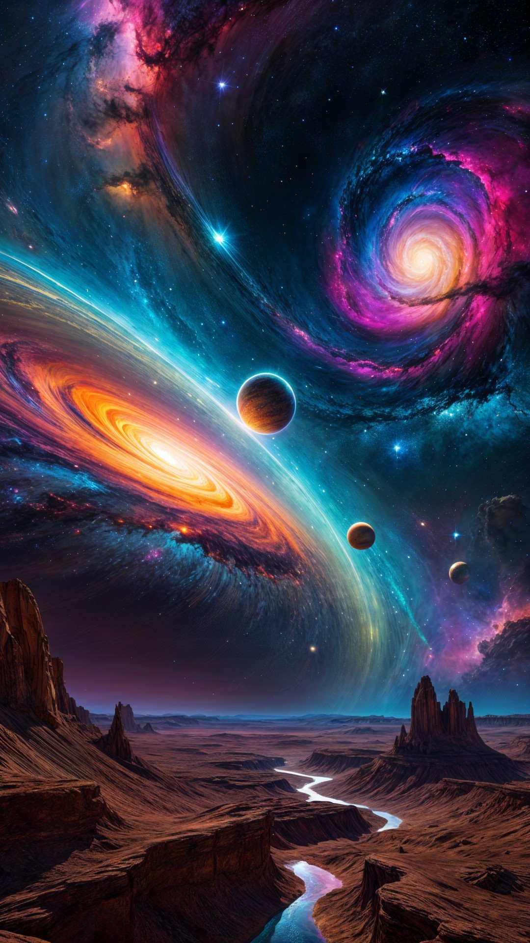 Prompt: "Vibrant cosmic landscape, swirling galaxies, distant stars, nebula clouds, alien planets, ethereal glow, dynamic composition, celestial bodies, intricate details, rich color palette, digital masterpiece, expressive brushwork, captivating textures, Blake Neubert inspired, high-resolution 8k quality, award-winning potential, depth of field effects, high dynamic range, fantastical elements seamlessly integrated."