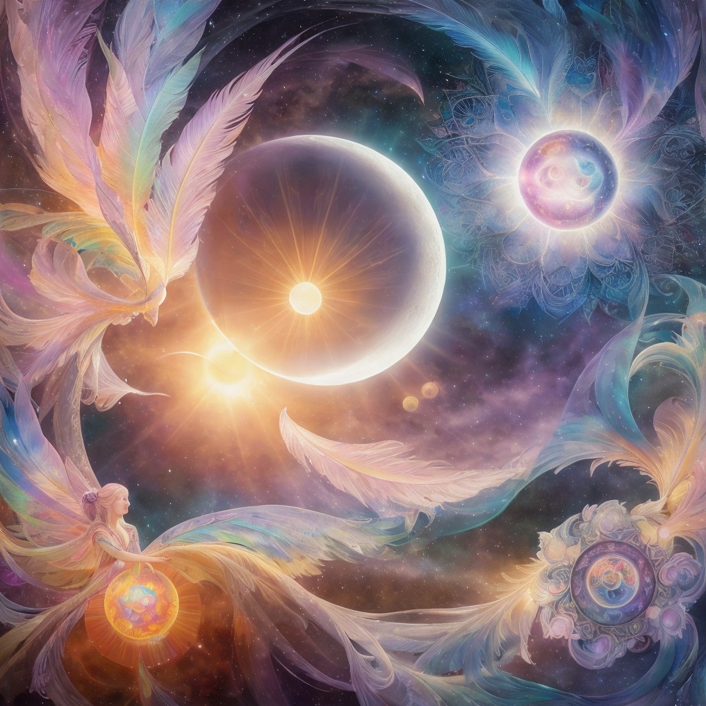 Moon and Sun in an ethereal, swirling sky, pastel colours, occult imagery, tarot, visionary style, Cameron grey, Alex grey, resin style paint, reflected light, heavenly, magic world, mystical, feather light, incredible view, consciousness, intricate surreal art