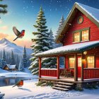 Red Cabin Surrounded by Snowy Evergreens at Sunset