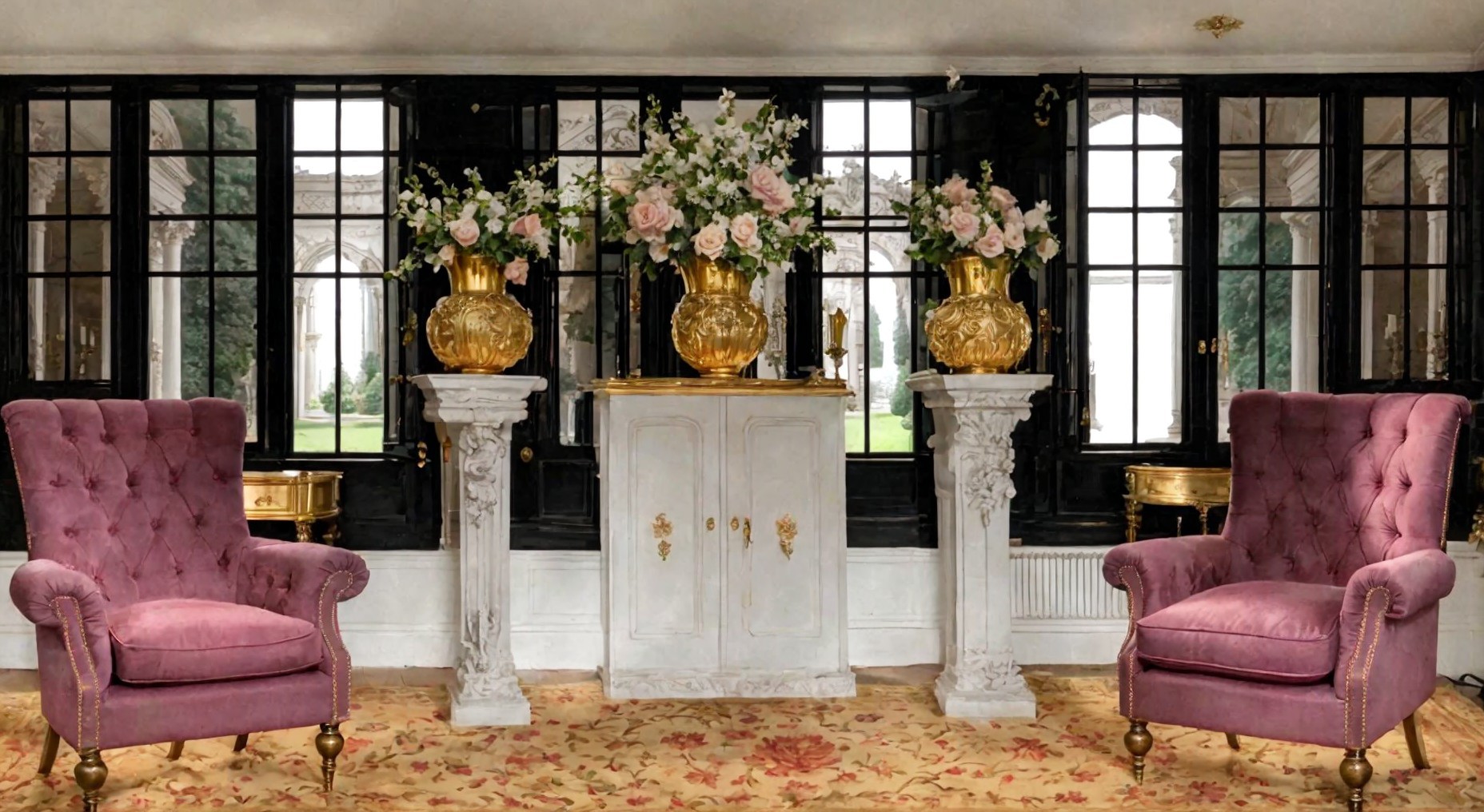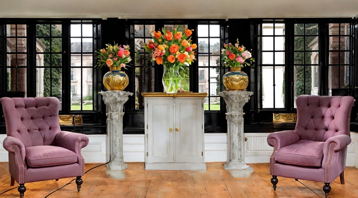 Elegant room with two plush mauve armchairs, a white fireplace, and large floral arrangements in golden vases by tall windows.