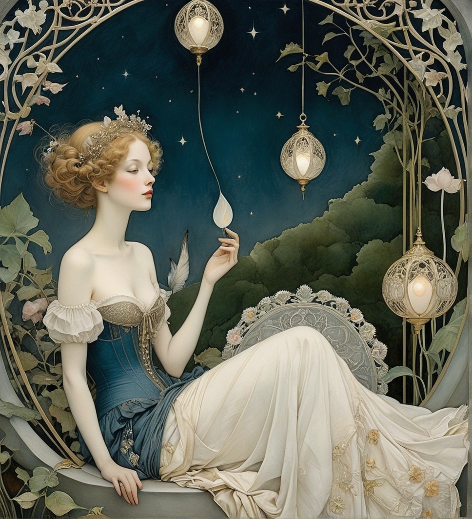 The image features a serene young woman in elegant attire, surrounded by decorative lanterns and floral elements, set against a dark, enchanted landscape. She gazes thoughtfully, exuding grace.