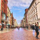 A picturesque European street scene features ornate buildings with intricate facades, lively outdoor cafés, and pedestrians enjoying a sunny day on a cobblestone street.