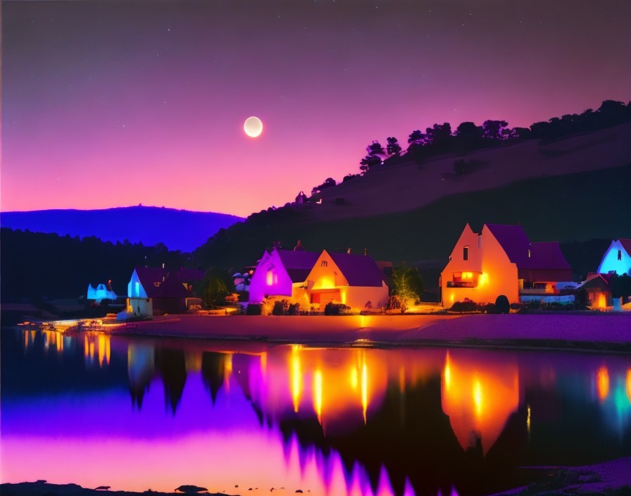 Prompt: "3D oil, full page, single image, no frame, no mat, no split image, no angled image, no people, spectacular village sunset, full moon, moon beams shimmering over the scene, reflecting river, pink to purple evening sky, satiny, high quality, shimmering, elegant, with vibrant saturated colors, elegant, highly detailed, glistening magic style, by William Taylor, with elements in the very best style of Gustav Klimt"