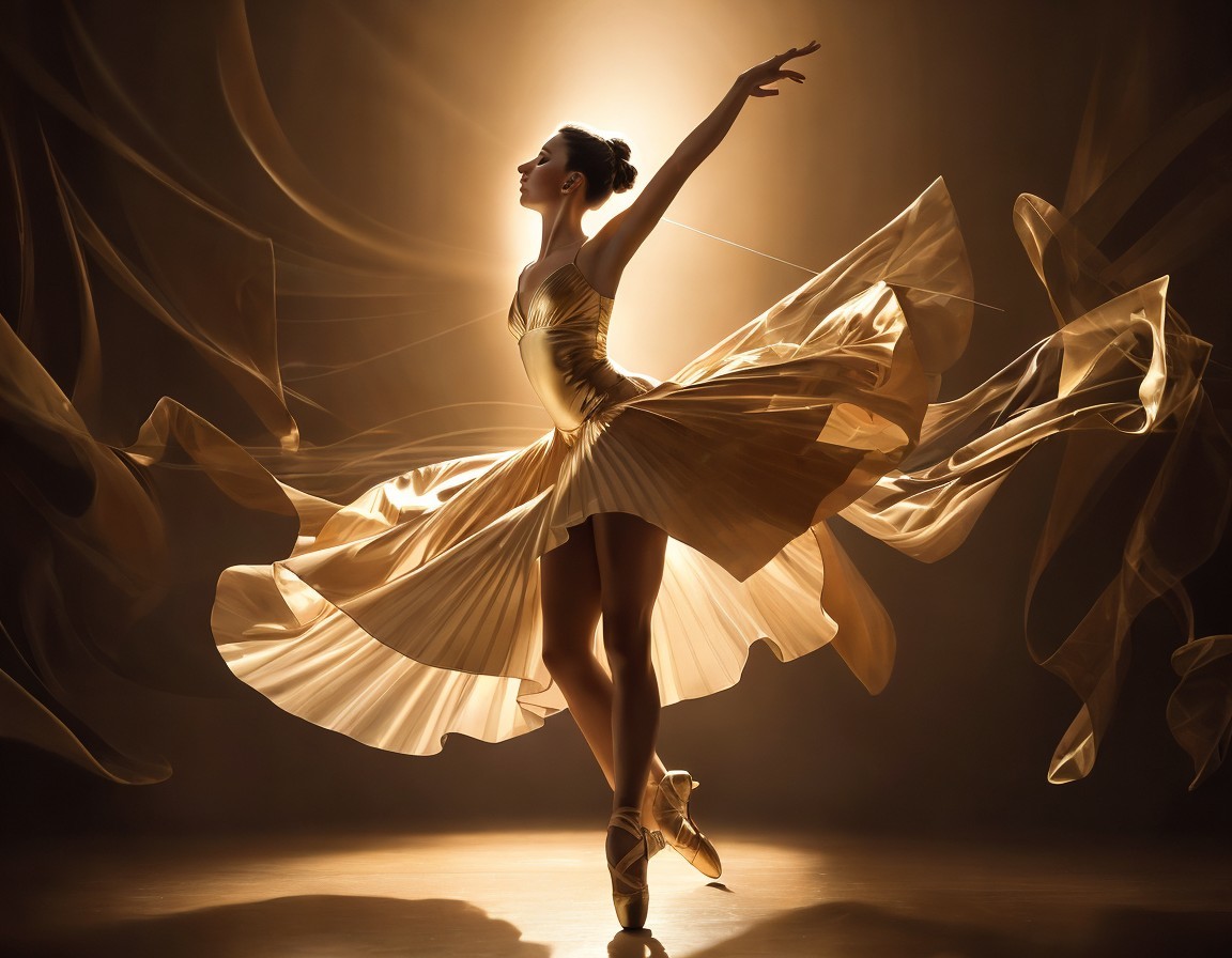 Prompt: Ballet dancer surrounded by golden musical notes, forefront, a violin projected in the background, cast in soft shadows, dancer's pose graceful and dynamic, elegance captured, majestic contrast between the sharp edges of the notes and the fluidity of the dance, chiaroscuro lighting, ultra fine, digital painting.