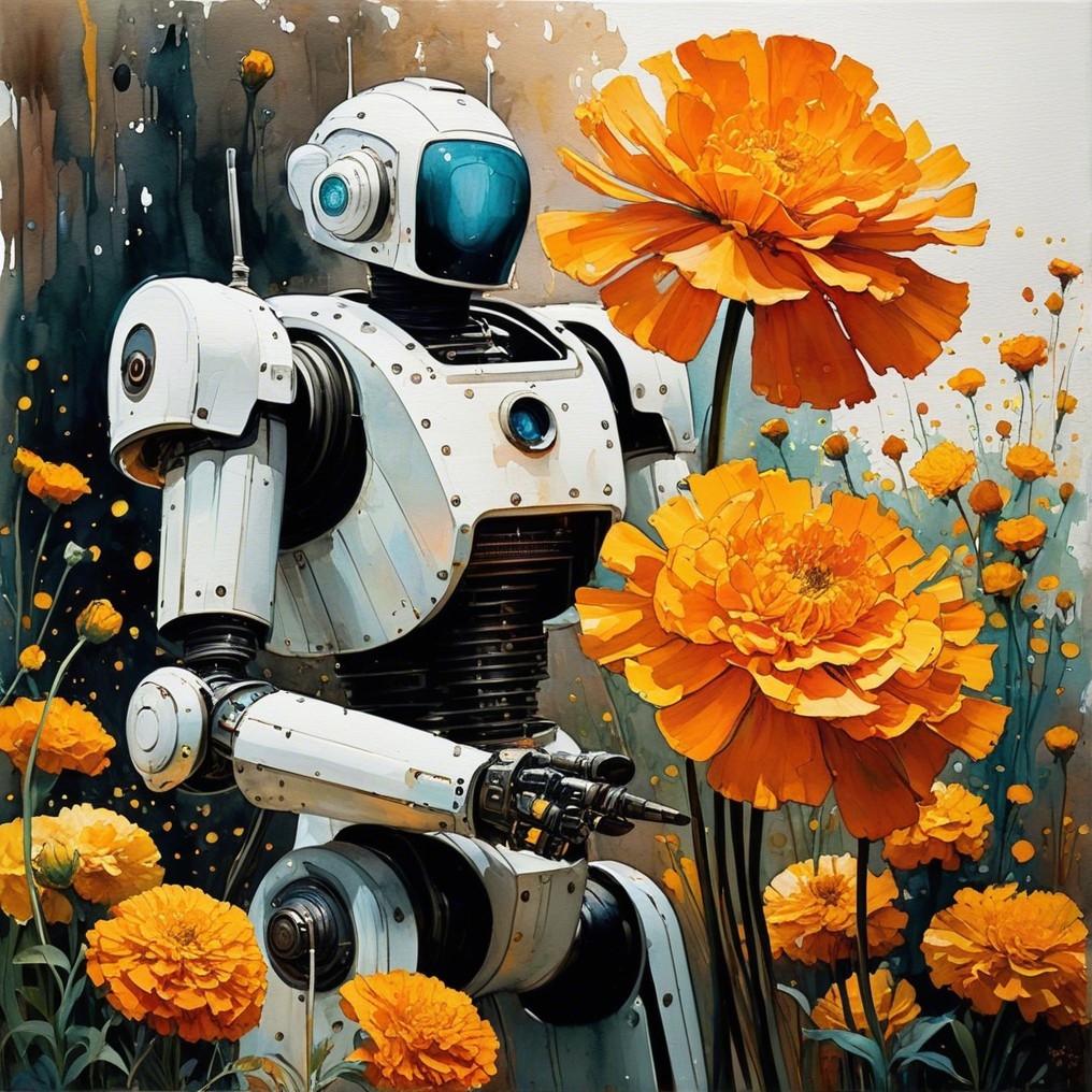 A humanoid robot stands in a field of vibrant marigolds, its metallic body subtly reflecting the warm orange hues of the flowers. With a soft glow in its visor and a peaceful setting, the piece explores the harmony between technology and nature in a serene, almost contemplative mood.