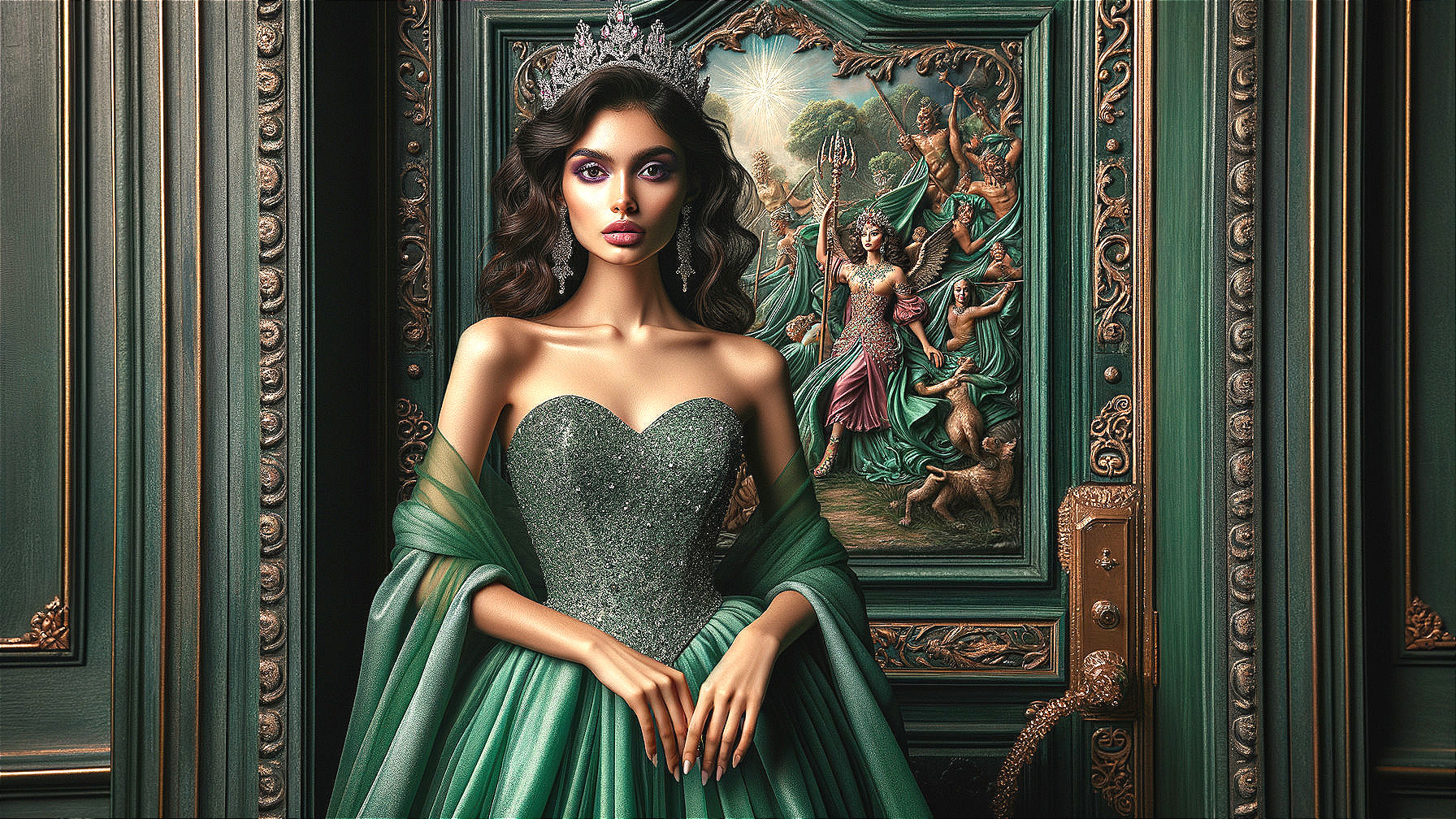 A glamorous woman in a sparkling green gown stands gracefully, adorned with a crown. Behind her is a richly detailed mural showcasing an enchanting scene, adding to the opulent atmosphere.