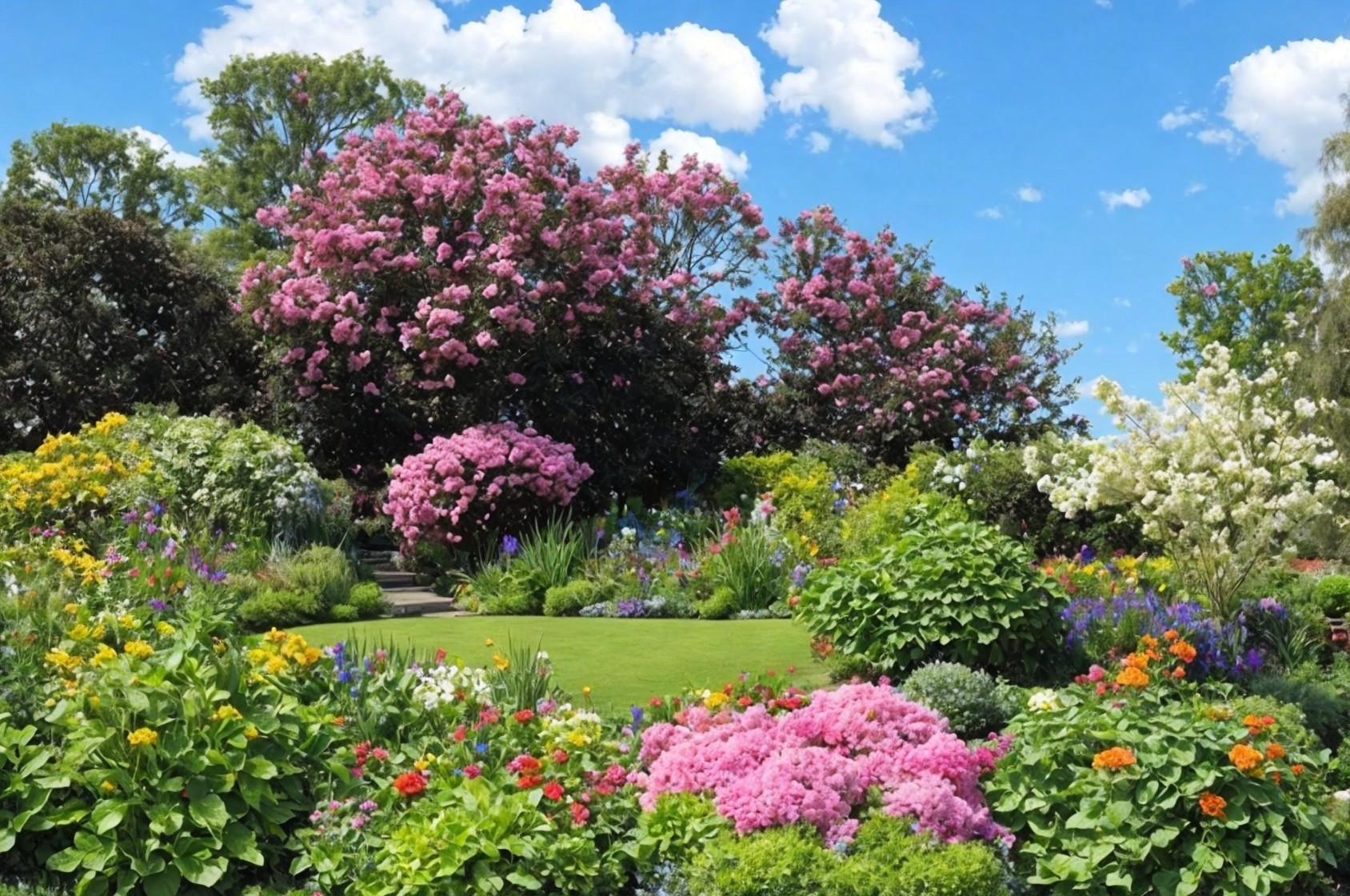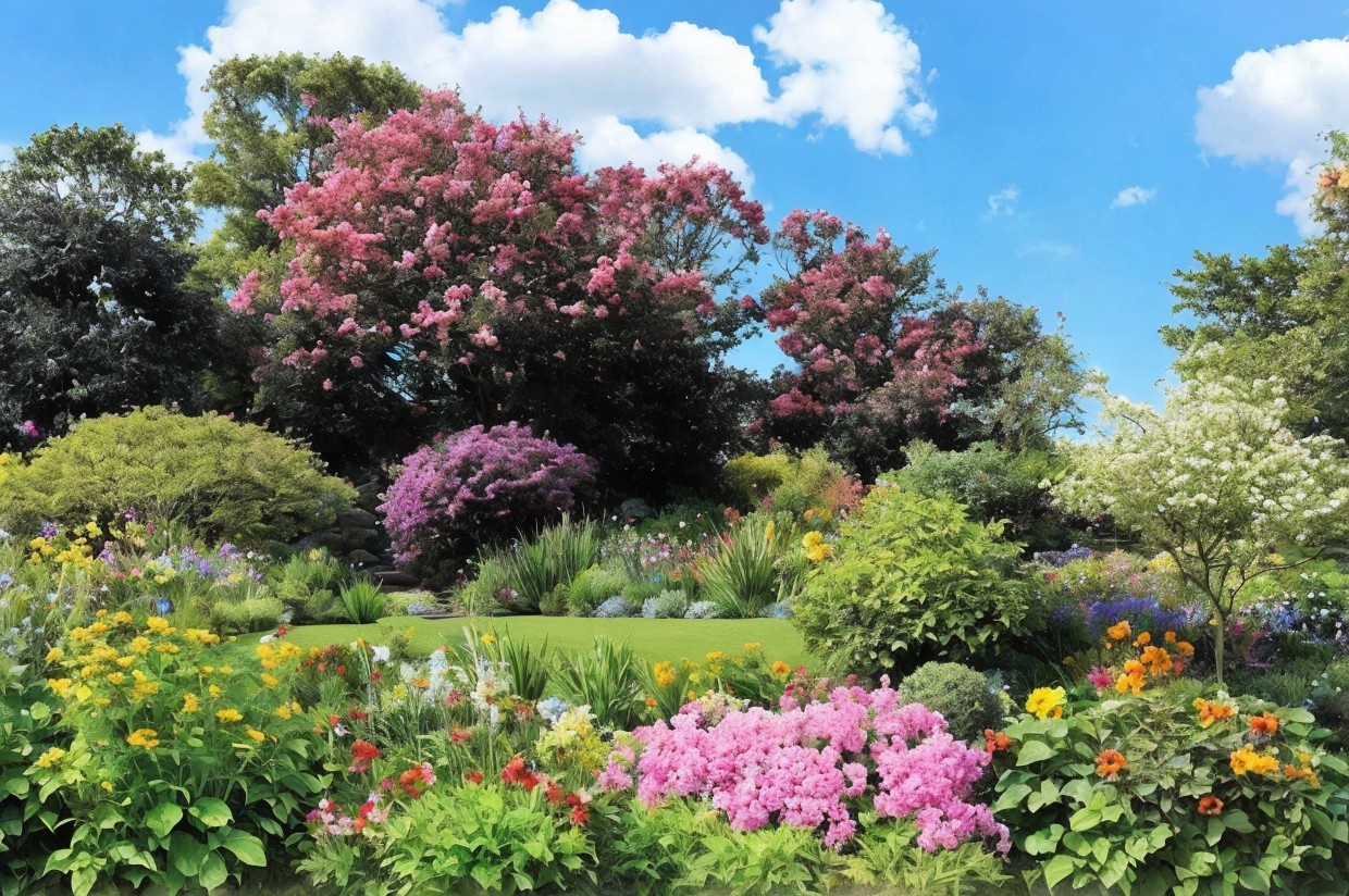 A vibrant garden features lush greenery and colorful flowers, including pink blossoms and neatly trimmed hedges, surrounded by statues and large rocks under a bright blue sky with fluffy clouds.