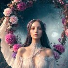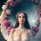 A serene figure stands before a floral arch, adorned with pink blooms. Her flowing gown and gentle expression evoke a dreamy, ethereal atmosphere, blending nature and fantasy beautifully.
