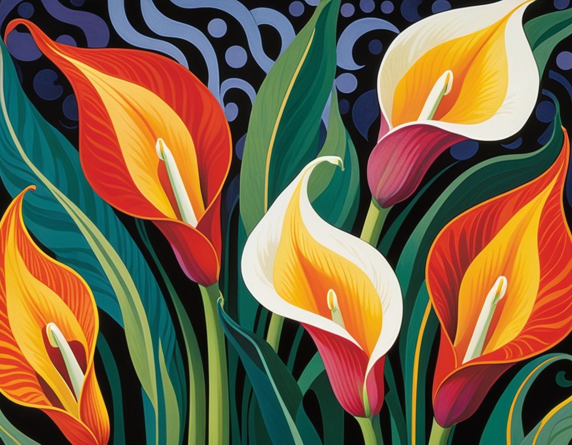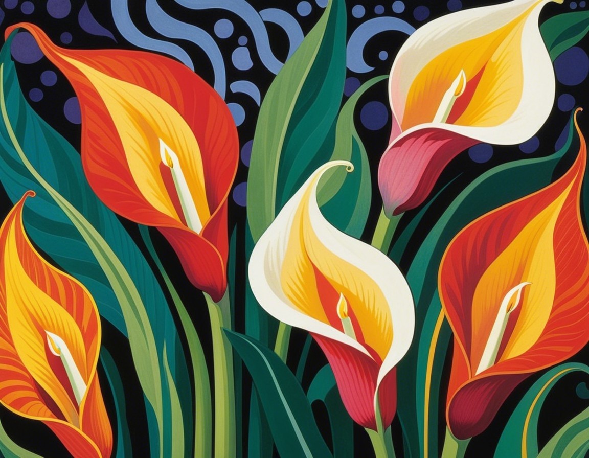 Prompt: Calla lilies with candle flames at their centers: enhance with more flame on the ends of the candles. Gustav Klimt, Ravilious, Eyvind Earle, Cressida Campbell. Linocut. Colours by Sonia Delaunay.