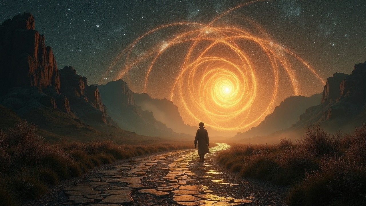 A lone figure walks along a winding path through a serene forest, leading towards a mesmerizing cosmic swirl of golden light and stars, evoking a sense of wonder and infinite possibilities.