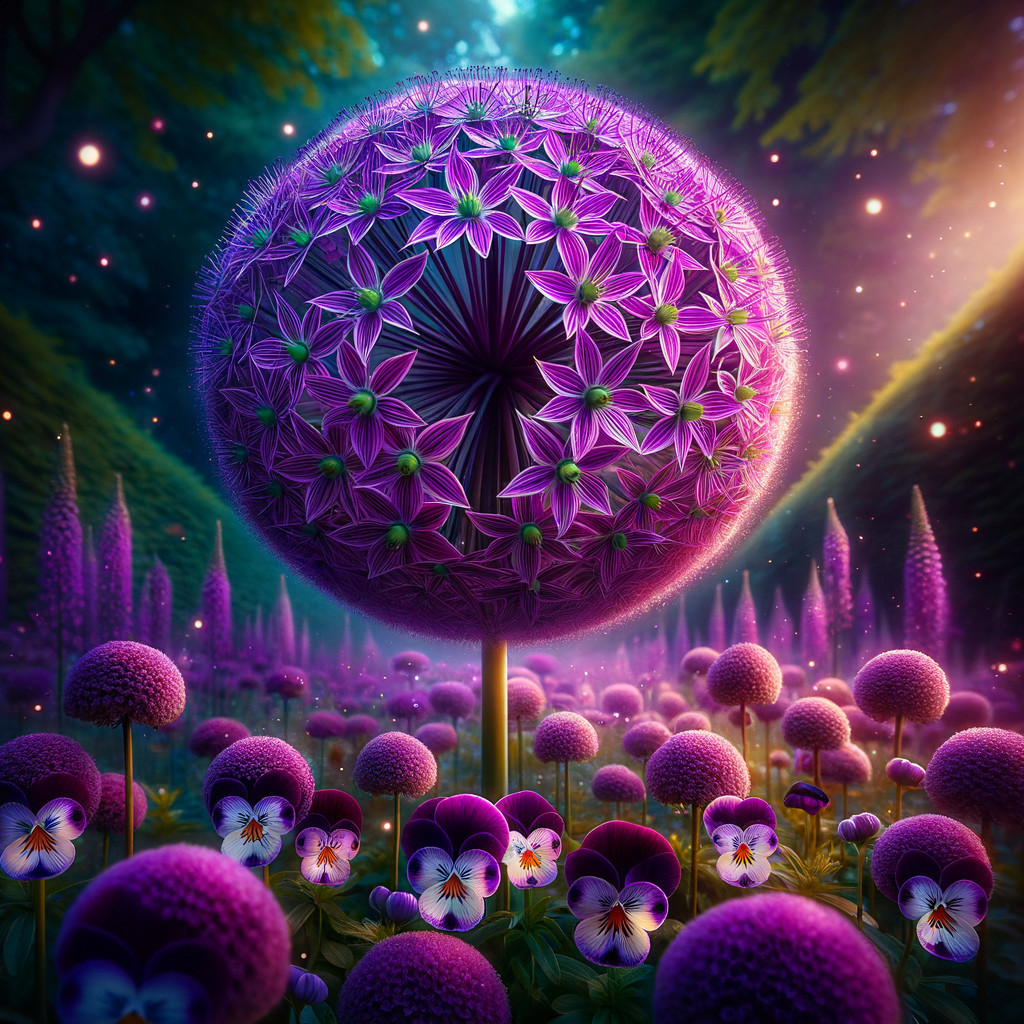 A vibrant, purple spherical flower stands out amidst a bed of similar blooms under enchanting, magical lighting.